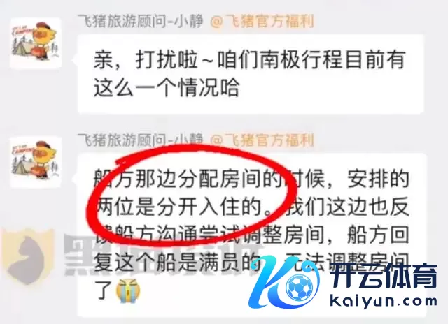 11月19日下昼现金九游体育app平台,“妻子花19万去南极思睡一间房被拒”话题冲上热搜。 据黑猫投诉,上海小朱(假名)和丈夫谈论本年12月去南极玩,临行前被讲演:妻子只可分房入住。 小朱说,旧年双十一我方在飞猪平台潦倒单购买了19万的南极邮轮游,因为支付名额,妻子分开下单一东说念主各付了一半。 本年4月,小朱称我方加了客服微信,明确我方和丈夫是同业的关系,并提交了成亲证。 10月,小朱被客服讲演,诚然那时定的是双东说念主间,但我方和丈夫的床位被分开在两间房间,何况需要和生分东说念主拼床睡。客