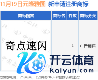 本站音讯,凭证企查查数据融会,近日北京元隆雅图文化传播股份有限公司新提交1件商标注册央求。商标央求确定如下: 本年以来北京元隆雅图文化传播股份有限公司新央求注册商标108件,罢休现在公司共握有注册商标1393件,另有384件商标尚在注册央求中。 数据起头:企查查 以上实质为本站据公开信息整理,由智能算法生成现金九游体育app平台,不组成投资忽视。