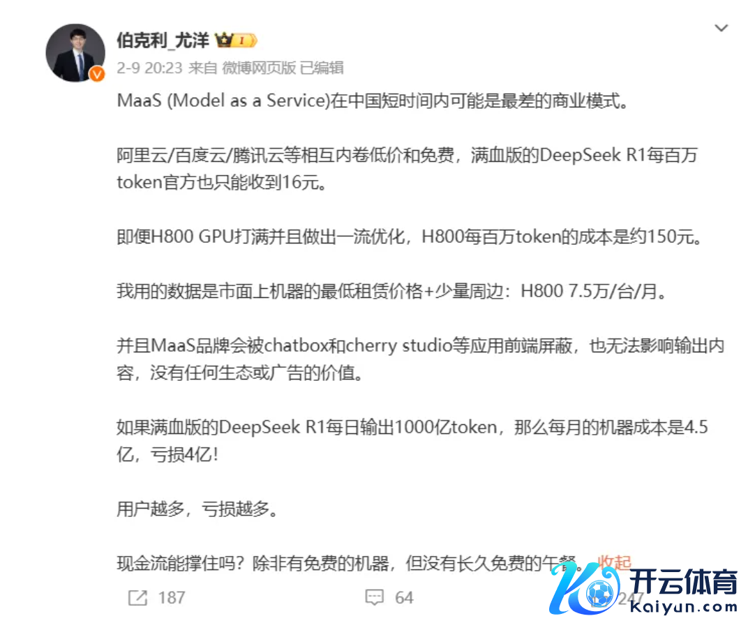 不外,潞晨科技CEO尤洋近日示意,满血版DeepSeek-R1每百万token(输出)订价16元,淌若逐日输出1000亿token,一个月算下来接入方企业可获取4800万元收入。据他测算,完成1000亿token的输出,需要约4000台搭载H800的机器,以现在H800的市价或者折旧来诡计,每月仅机器资本就达4.5亿元,因此企业方可能濒临每月4亿元的亏本,“用户越多,劳动资本越高,亏本越多”。