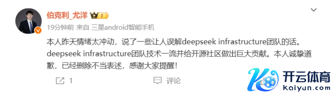 不外尤洋的上述言论也曾删除。今晨,尤洋发文致歉,称“本东谈主昨天豪情太冲动,说了一些让东谈主污蔑deepseek infrastructure团队的话。deepseek infrastructure团队时刻一流并给开源社区作念出浩大孝敬。本东谈主诚挚谈歉,也曾删除失当表述,感谢民众领导!”。