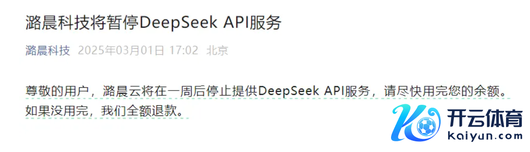 3月1日九游体育app娱乐,潞晨科技倏得秘书:“尊敬的用户,潞晨云将在一周后罢手提供DeepSeek API劳动,请尽快用完您的余额。淌若没用完,咱们全额退款。”