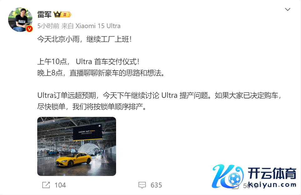 与此同期,雷军还披露小米SU7 Ultra的订单远超预期,今六合午将延续征询提产问题。