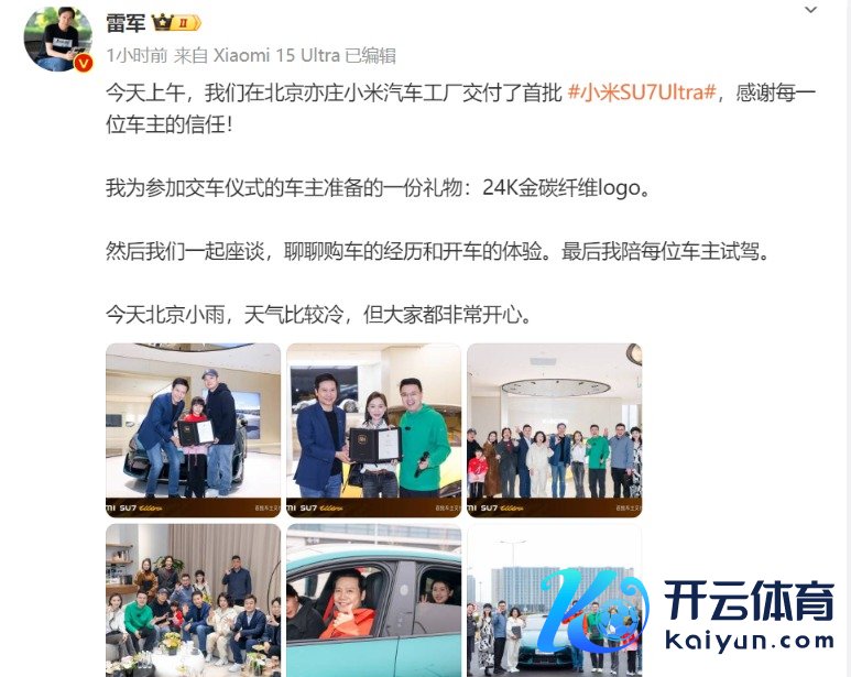 3月2日中午,雷军本东谈主发文:今天上昼,咱们在北京亦庄小米汽车工场委用了首批小米SU7Ultra,感谢每一位车主的信任!我为插足交车典礼的车主准备的一份礼物:24K金碳纤维logo。然后咱们沿途闲谈,终末我陪每位车主试驾。天然今天有点小雨,况且天气比拟冷,但全球王人十分兴盛。