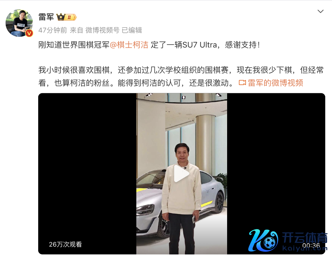 另外,雷军在发文称:刚知谈寰宇围棋冠军柯洁定了一辆SU7 Ultra,感谢支撑!