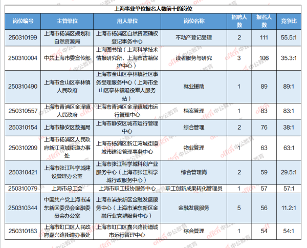 2025上海职业单元补招报名已于9月8日10时开动,本次上海市部分职业单元共招聘626东谈主,上海中公西宾汇总截至10月16时报名数据如下,补招报名第三日7796东谈主报名,上海市金山区亭林镇社区事务受理工作中心(上海市金山区亭林镇退役军东谈主工作站)竞争比达89:1。 ▪报名时期:9月8日-12日 一、各职位报名东谈主数分析 二、其他岗亭报名数据一览 三、竞争比最热十大专揽单元 四、报名东谈主数最多十大专揽单元 【扫码下载各岗亭及时报名数据表】 [笔试群] [小助手] [网站] 来领贵寓 【
