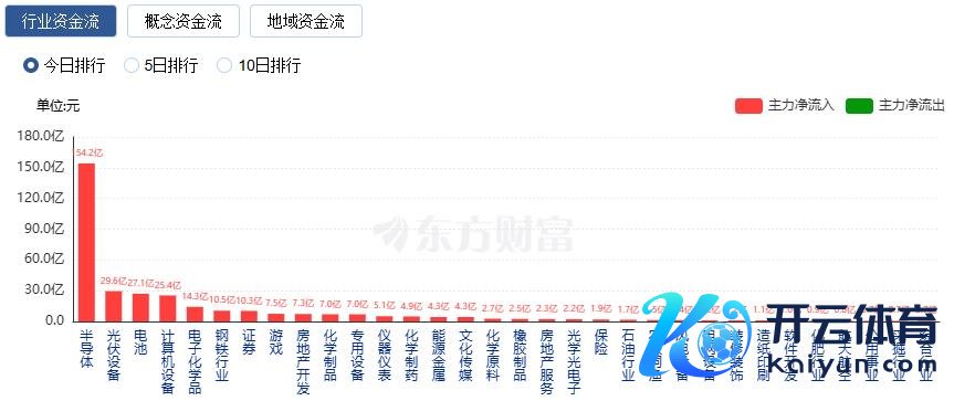 行业资金方面,阻抑收盘,半导体、光伏开导、电板等净流入排行靠前,其中半导体净流入154.2亿。